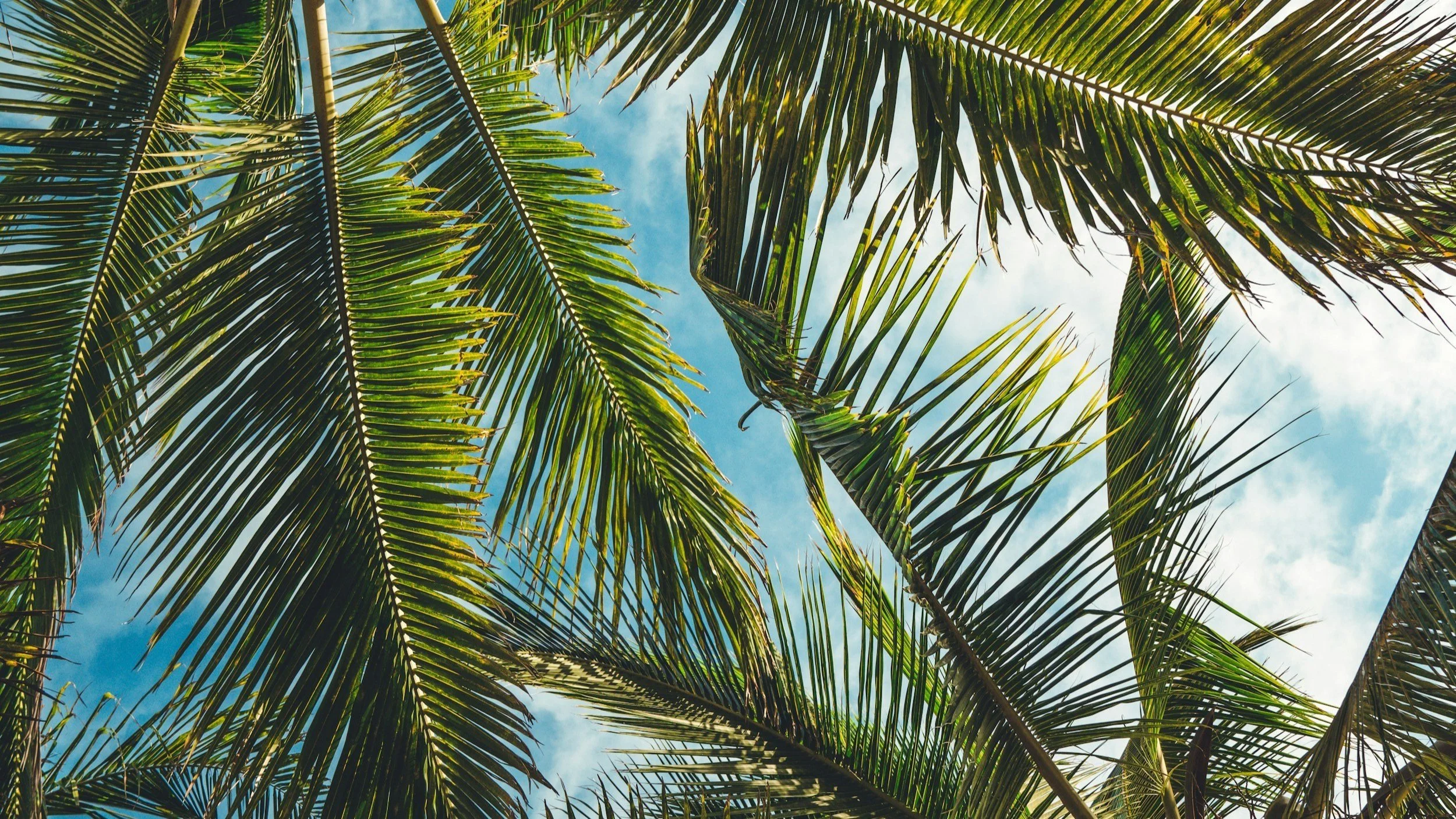 Looking up at palm tree fronds against a partly cloudy blue sky.